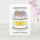 Illustration d'un grand gâteau d'anniversaire blanc recouvert de bougies éclairées et accompagné des mots "Joyeux anniversaire à un agent de voyage spécial".