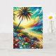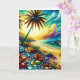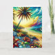 Jolie carte anniversaire. Vue colorée sur l'océan abstrait, palmiers, pierres de plage au coucher du soleil.