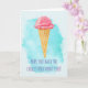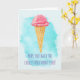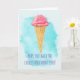 Une carte de voeux d'anniversaire "cool". Le texte dit : "J'espère que vous avez le plus beau anniversaire jamais". Un message à l'intérieur duquel peut être personnalisé, customisé ou laissé tel quel. Une délicieuse illustration de cône de crème glacée, avec une boule de crème glacée de fraise rose tenue par un cône gaufre. Placez-vous sur une plaque d'aquarelle bleu aqua / brosse.