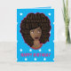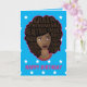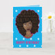Ce design est composé de "Queen, phénoménal, beau, intelligent, magique, patron, aimant, sexy, indépendant, drôle, créatif et fort" niché dans son afro, avec des colliers multicolores superposés avec bordure rose sur un arrière - plan étoilé, turquoise. Vous pouvez customiser plus loin avec votre propre message. Dans la carte on dit "HEUREUX ANNIVERSAIRE !"