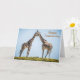 Carte d'anniversaire romantique joyeuse avec deux girafes debout cou à cou, face à face, dans une pose d'embrassement affectueuse contre un ciel bleu vif. Photo prise à San Diego, Californie.