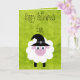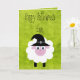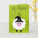 Joli et drôle vert personnalisable Happy Halloween Ewe carte de voeux avec un super mignon joyeux mouton de dessin animé souriant portant un casquette de sorcières - Par Molly Sky Designs. La carte est illustrée à l'intérieur et à l'extérieur.