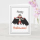 Carte avec mon oeuvre d'un mignon vampire essayant d'avoir l'air effrayant, avec le texte personnalisable "Happy Halloween". Un verset personnalisable à l'intérieur.