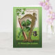 Carte de vœux 13 x 18 cm avec une image vintage de la harpe dorée d'Éirinn ornée d'un nœud vert et d'un joli trèfle vert. Un chapeau haut de forme noir est posé sur le sol à côté avec un bandeau vert. Le texte personnalisable à l'intérieur indique : « Puissiez-vous toujours marcher dans le soleil. Puissiez-vous ne jamais rien désirer de plus. Puissent les anges irlandais poser leurs ailes juste à côté de votre porte. Puissent vos poches être lourdes et votre cœur léger, Puisse la chance vous poursuivre chaque matin, midi et nuit. » Voir la collection complète de cartes de vœux de la Saint-Patrick dans la catégorie CARTES & AUTOCOLLANTS de la section FÊTES.