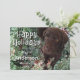 Envoyez une chaleureuse joie de vacances avec cette carte de charme avec un Labrador chocolat entouré de verdure festive. Le filtre artistique unique donne à l'image une sensation de livre d'histoires peint, parfait pour les amoureux de les chiens et tous ceux qui adores la magie de la saison. Une façon douce de souhaiter de très bonnes vacances à vos amis, à votre famille ou à vos collègues ! Gardez la photo ou personnalisez avec votre photo préférée, changez de salutation, de nom et d'année.