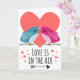 Cette carte de vœux de la Saint-Valentin représente deux petits oiseaux de dessin animé amoureux assis sur leurs branches avec un grand cœur rose en arrière-plan et quelques petits cœurs tout autour de la légende qui dit "l'amour est dans l'air".