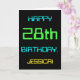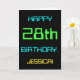 Ce design simple et amusant de carte de voeux d'anniversaire comporte un message comme "HAPPY 28th BIRTHDAY, JESSICA!". Son apparence s'inspire du domaine de l'informatique numérique. Le nom à l'avant et le message à l'intérieur peuvent être personnalisés. Il pourrait être envoyé ou donné à quelqu'un qui célèbre son vingt-huitième anniversaire et qui travaille (ou a travaillé avant la retraite) comme programmeur informatique, développeur logiciel, administrateur de base de données, administrateur réseau, ingénieur électronique ou qui aime utiliser des ordinateurs. [~Z0000100]