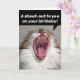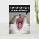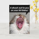 Un chat à la bouche large criant : "Un cri à vous pour votre anniversaire !" L'intérieur dit en gros caractères gras, "Je crie parce que vous ne pouvez pas m'entendre !" En petit type, il dit : "Vous êtes les bienvenus. Joyeux anniversaire !" Carte humoristique pour les personnes âgées qui sont trop têtues pour obtenir des appareils auditifs. Nous les connaissons tous. : D