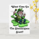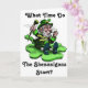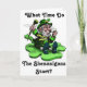 Un leprechaun irlandais assis sur un trèfle shamrock. Il demande "À quelle heure commencent les manigances ? Idéal pour la Saint Patrick !