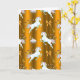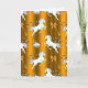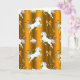 Une carte de Noël licorne dorée brillante présentant un motif de licornes, gambadant sur un fond doré magique. Elles ont toutes des cornes dorées, des cloches en or autour du cou et traînent une traînée d'étoiles dorées. Elles sont entourées de petits nuages de licorne kawaii avec des cornes en or, des rubans de Noël en or, de petits sapins de Noël dorés et un peu de poussière d'étoiles blanche en arrière-plan. Cette carte de Noël licorne serait une carte de vœux idéale à envoyer aux personnes qui aiment les licornes, la magie et la fantaisie pour Noël.