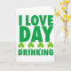 This card features the phrase “I LOVE DAY DRINKING” in large, all-caps sans-serif letters, stacked across three lines for a confident, flirty wink between friends 💚. “I LOVE” sits at the top in emerald green, like an opener that sets the tone without taking up too much space. The word “DAY” is centered and much larger, anchoring the design the way someone might lean in closer to make a point. Between “DAY” and “DRINKING,” four small shamrocks form a neat horizontal row, adding a cheerful St. Patrick’s Day nod ☘️. “DRINKING” runs along the bottom in the same emerald green, stretching wide and steady to finish the message. Everything sits on a bright white background with lots of open space, keeping the focus on the words and the shamrocks. The shamrocks are a light lime green, evenly spaced in a straight line beneath “DAY.”