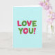 This card features the words “LOVE YOU!” centered on a soft pastel blue background. The message is set in big, chunky letters with an exclamation point, so it’s the first thing you notice. The letters alternate between hot pink and chartreuse green, giving the design a fun, upbeat look. Inside the pink letters, there are delicate swirls and curling patterns that feel like little decorations. Inside the green letters, you’ll see layered shapes and splashes of teal, yellow, and deeper greens that add extra detail and energy. With no characters or scenery, the simple background keeps all the focus on the message and makes it feel direct and honest ❤️. It’s a meaningful card to give because it says exactly what you want to say, while still looking special and thoughtful 🥰. Hope it helps you share your Valentine’s Day feelings with someone you care about.