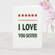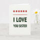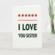 This card features an off-white background with the words “I LOVE YOU SISTER” centered in dark forest green, using a simple sans‑serif letter style that’s easy to read. Above the words, a thin red line runs horizontally, separating the message from the small decoration at the top. Near the upper edge, there are six evenly spaced red star-like flowers, each with eight pointed petals. The layout feels calm and focused, with lots of open space that keeps your attention on the message. The strong green text against the light background makes the words feel steady and sincere, while the red details add a sweet hint of love ❤️. It’s a meaningful card to give because it says exactly what you feel without extra fuss, which can be especially touching between sisters 🥰.