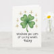 This card features a hand-painted four-leaf clover in emerald and lime green 💚, with four heart-shaped leaves that look softly translucent like watercolor. The clover sits in the upper half of the white background, and a slim stem drops downward as if gently reaching toward the viewer. Around it, eight irregular cross-like brushstrokes in warm rustic gold hover like little sparks, giving the scene a friendly, affectionate glow ☘️. The greens and golds stand out crisply against the white space, keeping the focus on the clover’s tender heart-leaf shape. Centered below the artwork, the message “SENDING YOU LOTS OF LUCKY WISHES TODAY.” appears in hand-drawn black lettering, slightly uneven in a way that feels like a note from someone close. The text is stacked in neat lines, with the final period adding a small, calm finish under the phrase. The gold marks form a loose ring around the clover, spaced unevenly so the circle feels airy rather than strict.