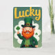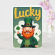 This card shows a smiling leprechaun front and center, with rosy cheeks and a thick orange beard that frames his face like a cozy collar. He’s dressed in deep green from top hat to suit, with shiny gold buttons and a gold buckle catching the light as if someone just brushed them for a night out. His arm reaches forward to offer a four-leaf clover 💚, and the gesture feels friendly and a little flirty, like he’s sharing a secret charm with someone close. A smaller shamrock floats nearby ☘️, tucked among soft white cloud shapes that curl around the scene. Above his head, the word “Lucky” sits near the top in golden lettering, arched like a small banner over his hat. The background is a textured green wash that looks brushed on, giving the whole image a warm, storybook setting. The greens range from dark emerald to lighter leaf tones, while the gold accents pop against the orange beard and the pale clouds. Near the top center, “Lucky” glows in gold above the leprechaun’s hat, with white cloud forms drifting around his raised hand and clover.