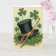 This card features a dark emerald green top hat set slightly off-center, with a shiny gold band and a bronze-red bow whose ribbons drape gently over the brim. A gold walking stick with a curved handle rests diagonally across the hat, like it’s leaning in close, adding a friendly, almost courtly touch between the two objects. Around them, shamrocks and four-leaf clovers fill the scene in many sizes and shades of green, forming a thick cluster near the bottom and scattering more lightly into the background ☘️. The lighting is soft and diffused, creating mild shadows that give the hat and cane a rounded, touchable look. The background shifts from creamy beige near the top to a pale green wash below, with a faint painted-paper texture that keeps everything gentle and cozy 💚. There’s no character face, yet the careful placement of the cane against the hat reads like quiet companionship, as if they’re sharing the same lucky moment. Any greeting text would sit best near the top in warm gold to echo the band, while the lower half stays filled with clovers and the red bow ribbons trailing over the brim.