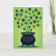 This design shows a dark, rounded cauldron sitting at the bottom center, its inky surface making the contents feel mysterious and inviting. From the opening, a fountain of four-leaf clovers bursts upward ☘️, their thin stems curving and crossing as they fill most of the card. The clovers shift through several greens, from deep emerald to softer spring tones, and their shapes stay crisp against a lime-green background that fades gently from lighter to slightly deeper color. Tucked among the leaves are small red hearts that float upward like they’re caught in the same lift, adding a quiet, affectionate spark 💚. The way the hearts weave between the clovers reads like a friendly flirtation, as if luck and love are chasing each other through the air. Near the top, the greeting text sits centered in a medium green, spaced so it doesn’t crowd the clover stems. The overall scene stays bright and airy, with the cauldron grounded below and the clovers and hearts rising into the upper corners.