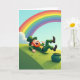 This St. Patrick's Day card shows a laughing leprechaun stretched out on a bright green hillside, relaxed as if he’s sharing a private joke with a close friend 💚. He wears an emerald suit with a tall hat and buckled shoes, and his rosy cheeks and wide grin make him feel easy to root for. A warm orange beard stands out against all the greens, adding a lively contrast to his face. Across the top, a wide rainbow 🌈 arcs through a light blue sky, with a few soft clouds drifting in from the left. The slope is dotted with small shamrocks, and the gentle curve of the hill guides your eye down the scene. In the lower right, a dark green pot sits slightly tucked into the grass, like a quiet invitation to step closer and look. The greeting text appears near the top in green, set against the sky so it’s easy to read, while the rainbow bands stretch behind it.