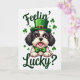 This card shows a cute cartoon puppy, like a little Shih Tzu, facing forward with big amber-brown eyes that seem to lock onto yours in a friendly, flirty way 💚. Its small paws rest over a simple ledge, as if it’s leaning in for attention, with a tiny pink tongue peeking out. A tall emerald leprechaun hat with a shiny gold buckle sits on its head, and an oversized green bow tie adds a dressed-up, date-night feel. The background is bright white, making the greens stand out, while scattered shamrocks float around the edges for a festive touch ☘️. At the top, the word “Feelin’” appears in emerald-green lettering, centered above the puppy’s head. Below the ledge, “Lucky?” is also centered in matching green, balancing the layout and framing the pup’s face. Around the outer area, small green shamrocks are spaced like confetti against the white space.