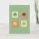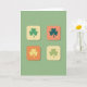 This card features four stylized shamrocks arranged in a neat 2x2 grid on a muted sage green background, with each clover sitting inside a rounded square tile. The tiles alternate between creamy beige and warm peach, and a soft shadow under each one gives a slight lift, like they’re gently floating side by side. The shamrocks themselves shift from fresh spring green to deeper teal, with one in a soft sunny yellow, creating a calm mix of cool and warm tones 💚. The careful spacing and matching shapes make the design feel like a quiet shared moment, as if the clovers are paired up in friendly conversation ☘️. Any greeting text would sit best centered beneath the grid in a light cream or pale peach, keeping the layout balanced and easy to read. If a shorter line is added, it could also appear in small type at the top, aligned to the middle in a darker teal to echo the leaves. Each rounded square has smooth corners and a gentle, diffused shadow that stays close to the edges.