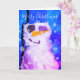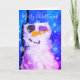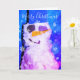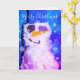 Magical Snowman and Snowflakes Joyeuse carte de Noël - Carte de Noël festive avec un bonhomme de neige et des flocons blancs sur un arrière - plan bleu abstrait. Le souhait Joyeux Noël est en écriture blanche.