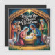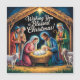 Une illustration classique et révérencieuse de la scène de la Nativité, représentant Marie et Joseph agenouillés auprès de l'enfant Jésus endormi dans une mangeoire sous l'étoile de Bethléem. La scène, située à l'intérieur d'une étable, est complétée par la présence de bergers et de petits agneaux, relatant l'histoire traditionnelle de Noël. L'image comprend un message festif en écriture cursive : "Je vous souhaite un Noël béni !".