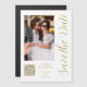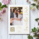 Save The Date White Gold Stylish Script Modern Mariage Magnetic Card dispose d'un arrière - plan blanc avec votre photo personnalisée. Personnalisez avec votre texte en modifiant le texte dans les zones de texte fournies et ajoutez l'URL de votre site Web pour votre code QR personnalisé. Conçu pour vous par ©Evco Studio www.zazzle.com/store/evcostudio