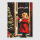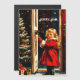 Carte magnétique avec un design graphique de Noël d'inspiration vintage. Une petite fille mignonne en manteau rouge se tient au seuil de la porte. Elle sourit.La nuit étoilée en plein air contraste magnifiquement avec le sapin de Noël festif dans le hall. Il est livré avec le voeu de Noël français " Joyeux Noel ". Grâce aux outils polyvalents Zazzle, vous pouvez customiser facilement du texte et des polices. __________________ Design réalisé en collaboration avec Canva AI et Alma Wad le concepteur humain.
