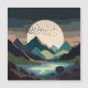 Paysage abstrait d'une gigantesque lune sur une scène de lac de montagne avec un troupeau d'oiseaux aux textures audacieuses et aux tons terre foncés de brun, beige, tan, bleu, cyan et noir.