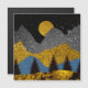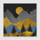 Paysage montagnard Abstrait dans des tons audacieux d'or, noir et bleu avec un lever de lune et des oiseaux.