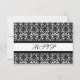 Cartes de mariage RSVP en aubergine élégante et chic noir et blanc avec motif classique floral damassé. Personnalisable avec les détails de votre mariage, disponible dans de nombreux produits mariages correspondants.