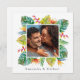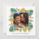 Si vous planifiez un mariage à thème tropical, c'est la carte SAVE THE DATE parfaite pour exciter vos invités à propos de votre prochain événement. Votre photo est entourée de fleurs tropicales aquarellées et de feuillage. Au verso, Save the Date est écrit à la main dans un script de brosse dorée avec la date surlignée d'une ellipse dorée.