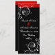 Elégante carte de menu mariage de fleurs rouges et noires à feuilles florales, avec des feuilles blanches, des tourbillons et des boucles et des points rouges sur arrière - plan noir. Il y a une bande rouge avec votre texte en haut. Design élégant, élégant et chic, parfait pour un mariage d'hiver.