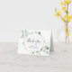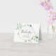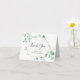 Conçu pour s'harmoniser avec notre collection de mariages Eucalyptus Greenery, ce Carte de remerciements personnalisable présente un feuillage vert menthe à l'aquarelle d'eucalyptus accentué d'un cadre géométrique bordé de blanc et d'or. Ajoutez du texte personnalisé dans une écriture élégante, ainsi qu'un message intérieur facultatif.
