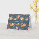Carte de remerciements avec un motif fait de renards orange mignons et heureux. Arrière - plan vert foncé. Des petits champignons parsemèrent.