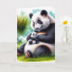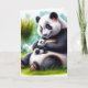 Un ours-panda-mère écrase un panda-bébé dans une prairie verdoyante, avec du bambou qui balance doucement dans l'arrière - plan. Tout le texte peut être modifié.