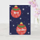 This card beautifully captures the calm essence of the holiday season with two red Christmas ornaments set against a deep navy blue background. The ornaments stand out with their rich red color and are arranged to spell "Merry Christmas" in elegant white writing. Each ornament is decorated with green foliage and hints of golden berries, adding a traditional touch. Intricate white swirls and dots adorn the red spheres, adding a festive touch to the design. The blue backdrop is filled with white starbursts and shimmering particles, creating a celestial scene reminiscent of a snowy night or twinkling stars. The combination of bold reds and greens with the glittering blue background creates a visually inviting and harmonious image. This card radiates a sense of peace and magic, perfect for spreading holiday cheer 🎅🏼🎄🎁. Share the joy of the season with this enchanting visual greeting.