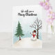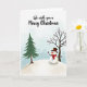 The holiday card shows a cozy winter scene with a snowman 🎅🏼 wearing a red scarf and black hat. He has a big smile 😊 and looks like he's waving hello. There are trees with red berries 🎄 and a blue sky. The card says "We wish you a Merry Christmas" in fancy letters at the top. Everything looks peaceful and happy, like a calm winter day. It's a perfect card to spread holiday joy and cheer 🎁.
