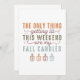 Ce design humoristique et cosy d'automne présente la phrase spirituelle "La seule chose qui s'allume ce week-end, ce sont mes bougies d'automne" dans un mélange de polices grasses et élégantes. Le texte est disposé de manière créative avec des tailles et des styles de police variés, ajoutant un intérêt visuel et un ton ludique. La palette de couleurs comprend des teintes automnales chaudes comme l'orange brûlé, les verts terreux et les bruns doux, qui évoquent la chaleur et le confort de la saison.