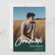 Écriture blanche moderne superposition "Graduate", faire-part de remise de diplômes photo de classe supérieure et invitation en vert. Lignes modèles pour le nom du diplômé, la classe de l'année et l'école. Le dos de la carte comporte 2 espaces photo supplémentaires avec des lignes de texte pour les détails de votre fête d'ouverture/remise des diplômes.