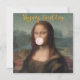 Mona Lisa soufflant du chewing-gum rose. Texte "Joyeux Anniversaire" en or.