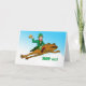 ATTENDS ! Saint Paddy's Day. Carte de voeux de la Saint-Patrick avec un leprechaun tenant une bière et chevauchant une grenouille. La grenouille vole à travers le ciel bleu clair. Le leprechaun est habillé d'un costume vert, de bas rayés et porte un casquette vert. Copyright © Shoaff Ballanger Studios, 2024.