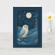 A snowy owl perches in quiet watchfulness beneath a glowing full moon in this layered papercut-style illustration. Surrounded by snow-covered hills, bare trees, and coniferous branches, the owl’s luminous yellow eyes and soft feather markings evoke mystery, solitude, and emotional depth.
