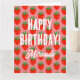 Carte d'anniversaire motif aux fraises rouges mignonnes. Design amusant pour amis, famille, végétarien, amoureux de fraises etc. Personnalisez avec un nom et un message personnalisés à l'intérieur. modèle de typographie vintage cool. Carte de voeux de grande taille avec grande enveloppe en option.