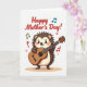 Cette carte présente une petite créature mignonne avec un dos hérissé, des joues roses et un large sourire à bouche ouverte tandis qu'elle pince les cordes d'une guitare acoustique, comme si elle serenait quelqu'un qu'elle adore ❤️. Ses yeux brillants et sa posture penchée vers l'avant suggèrent une performance amicale et affectueuse, comme une douce chanson partagée juste pour Maman. La créature est colorée de bruns chauds et de crèmes douces, avec de petites pattes enroulées autour du manche et du corps d'une guitare riche de couleur brun-rouge. Près du haut, les mots « Joyeuse fête des Mères ! » apparaissent en lettres rouges, s'incurvant au-dessus du personnage de sorte que le salut soit la première chose que vous remarquiez. Autour de la scène, des notes de musique dispersées flottent dans des tons olive vert, sarcelle et rouge profond, ajoutant un mouvement comme si la mélodie dérivait dans l'air. De petits cœurs rouges se mêlent aux notes, laissant deviner une proximité tendre sans avoir besoin de mots supplémentaires 🌼. Tout repose sur un fond