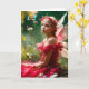 Une jeune fée magnifique avec des ailes délicates et une robe rouge est assise au milieu d'un jardin luxuriant entouré de fleurs et de feuilles. Elle porte une couronne de fleurs et regarde pensivement au loin, baignée dans une lumière douce et naturelle. Elle a l'air si triste qu'une abeille qui passe éclate en larmes.