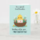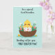 This card shows a bright yellow baby bird peeking out of a cracked eggshell, its rosy cheeks and one winking eye giving it a flirty, friendly charm 🐣. The eggshell is decorated with tiny flower and abstract shapes in red, blue, and white, adding small bursts of color around the bird. The little bird sits snugly in a brown woven basket, like it’s being gently looked after by someone close. On either side, leafy green sprigs and small blossoms in white, pink, and yellow lean inward, creating a cozy, together-at-the-center feeling 🌷. The background is a soft pastel blue, like a calm spring sky that keeps the scene light and airy. Curved lettering appears above the illustration in a darker tone, and a second line of matching text sits below the basket, neatly framing the image. The basket’s woven texture is shown with fine crosshatch lines, and the eggshell pieces have crisp edges with tiny patterned details.