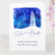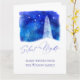 Carte de voeux de Noël personnalisable pliée avec joli dessin original bleu et blanc d'une scène de neige avec ciel bleu foncé avec étoiles, flocons de neige, et un arbre avec texte de script fleuri en bleu Silent Night. Ajoutez votre propre texte ci-dessous pour un salut de vacances personnalisé. Art copyright Ann Powell tous droits réservés.
