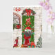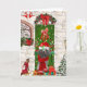Idée cadeau de Noël pour les amoureux des chiens : Caniche assis à l'extérieur d'une maison décorée avec une couronne de Noël, un sapin de Noël