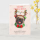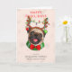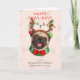 Salutations pour les vacances d'un carlin mignon portant des bois de cerfs et des lumières à cordes colorées.